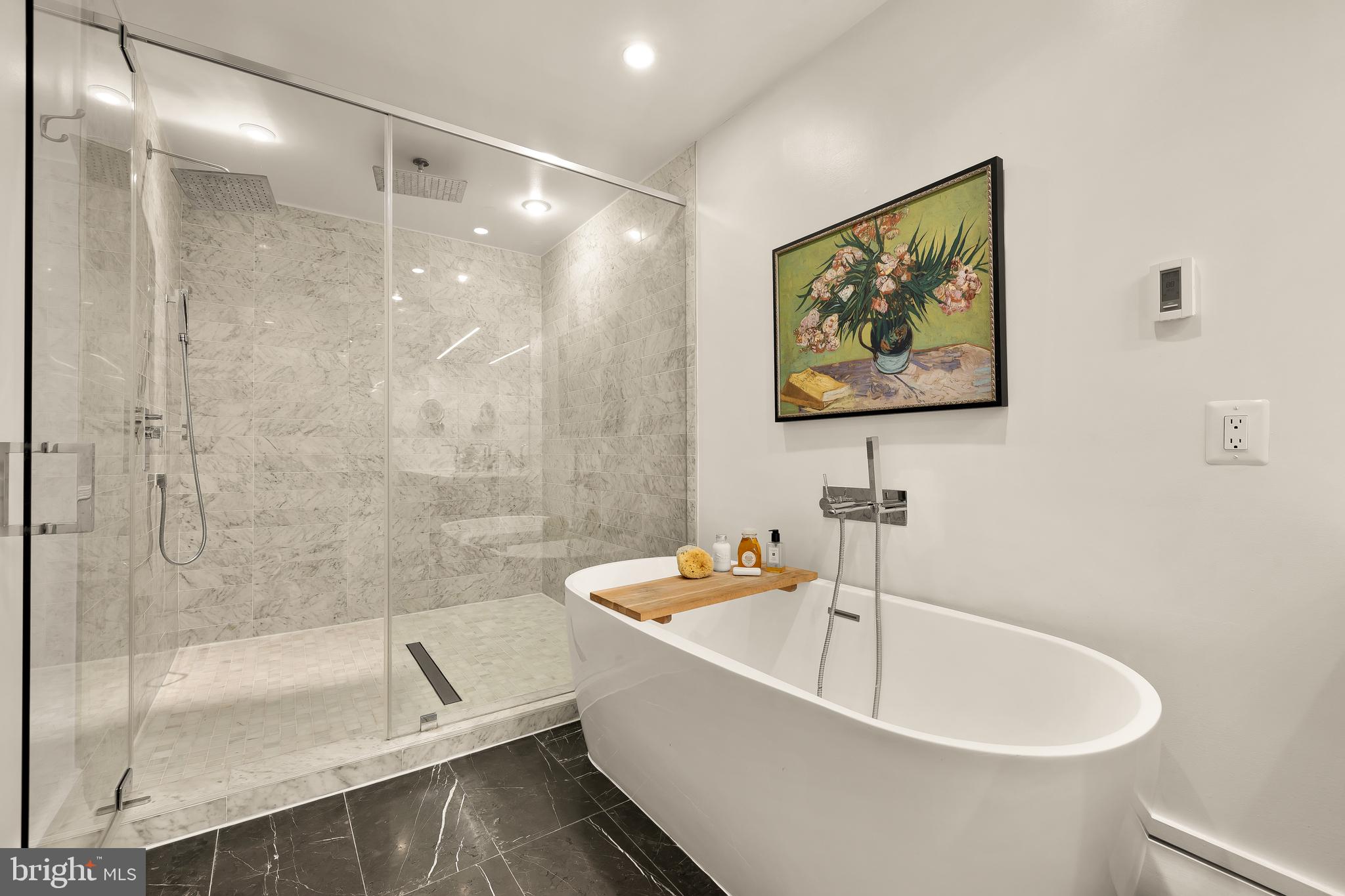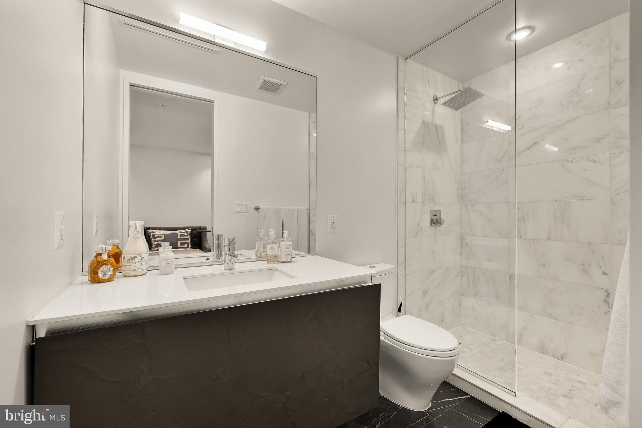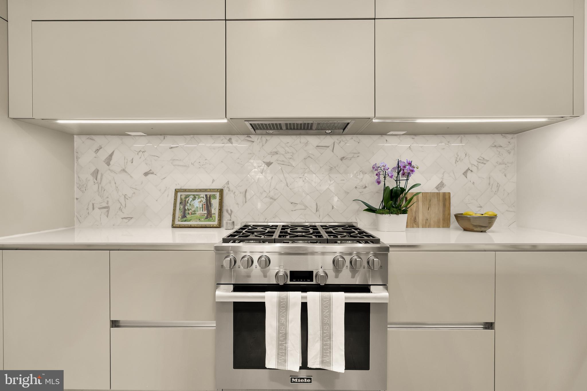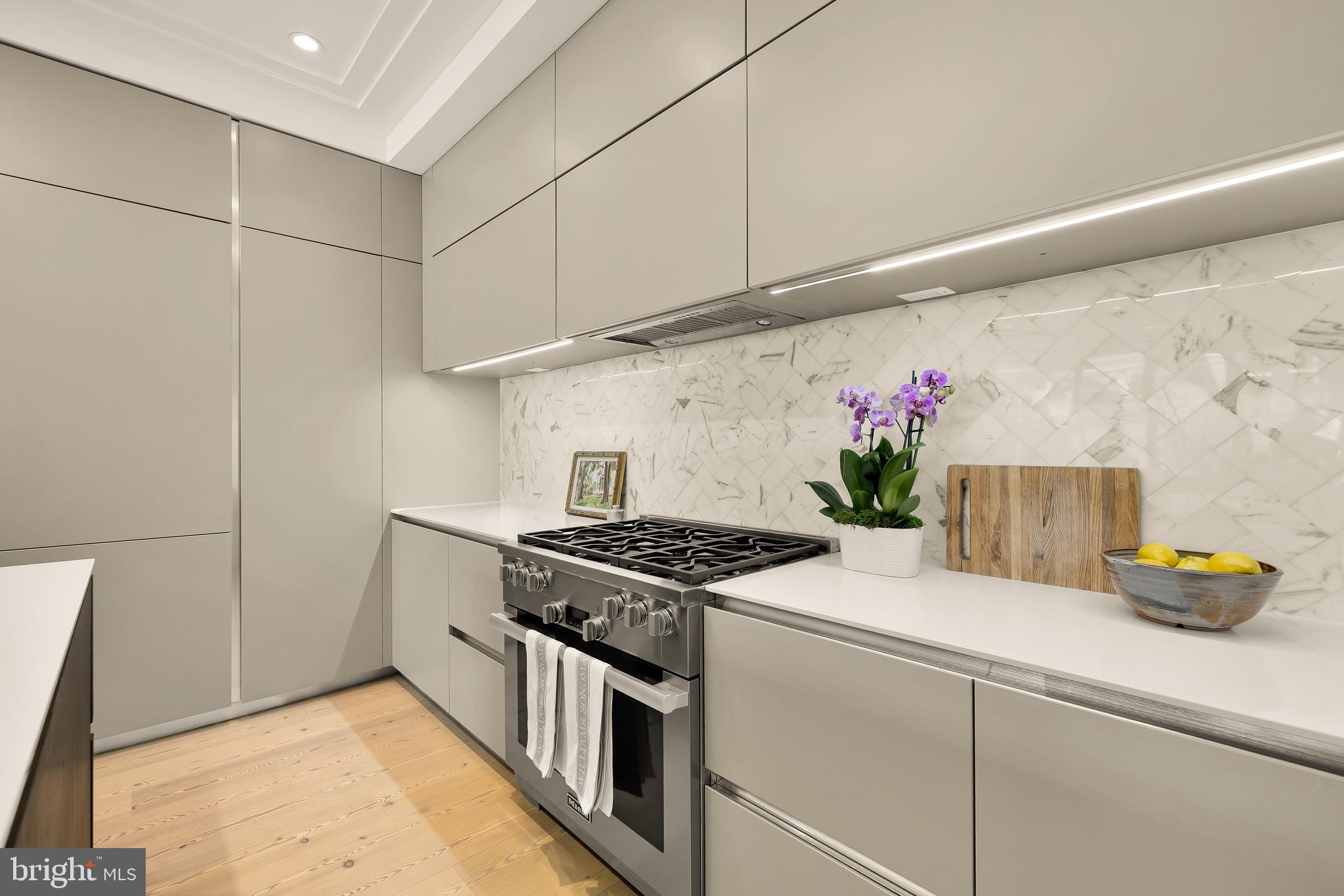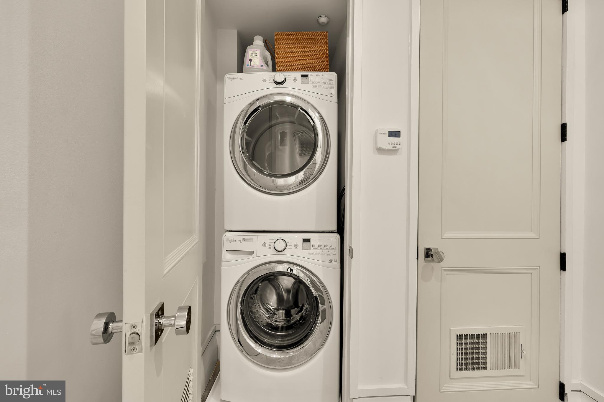 1837 Wyoming Avenue is located on a tranquil block, straddling the boundary between the prestige of Kalorama and the energy of Adams Morgan, a boutique building comprising of luxury condominiums finished to the highest degree. The facade of the building evokes reserved elegance with its inlaid red brick and classic dormers. Amongst this distinguished company is Unit B, a private rear duplex spanning a generous 1,633 square feet of elegant living space. The main level is a fully open concept space encompassing living, dining, and kitchen areas. High ceilings, wide-plank white oak floors, recessed lighting, and a floor-to-ceiling glass wall opening onto the rear patio. The chef's kitchen combines form and function, with Italian cabinetry complementing a herringbone marble backsplash and contrasting Dekton center island and suite of Miele appliances, including a commercial-grade gas range and built in espresso machine. The outdoor space, with its brick paver patio, and uplit landscaping, is a coveted amenity in such a central location. A glass-railed staircase leads down to the bedroom level, where the primary bedroom showcases herringbone white oak floors. Double doors open into the ensuite bath with contrasting dark and light marble, featuring heated floors, a double floating vanity, freestanding soaking tub, and oversized walk-in glass shower. A walk-in custom California Closet completes the suite. The second bedroom also features ample storage and a marble ensuite bath with radiant floor heating. Glistening Emtek hardware and a surround sound system are found throughout. Convenient in-unit laundry, a separate powder room, and available RENTAL PARKING are additional desirable features. A second rental space is also available. The location is truly incomparable, being steps from the natural retreat of Kalorama Park, and vibrant dining scene including Lapis, Maison Bar a Vin, Cana, and Tatte.