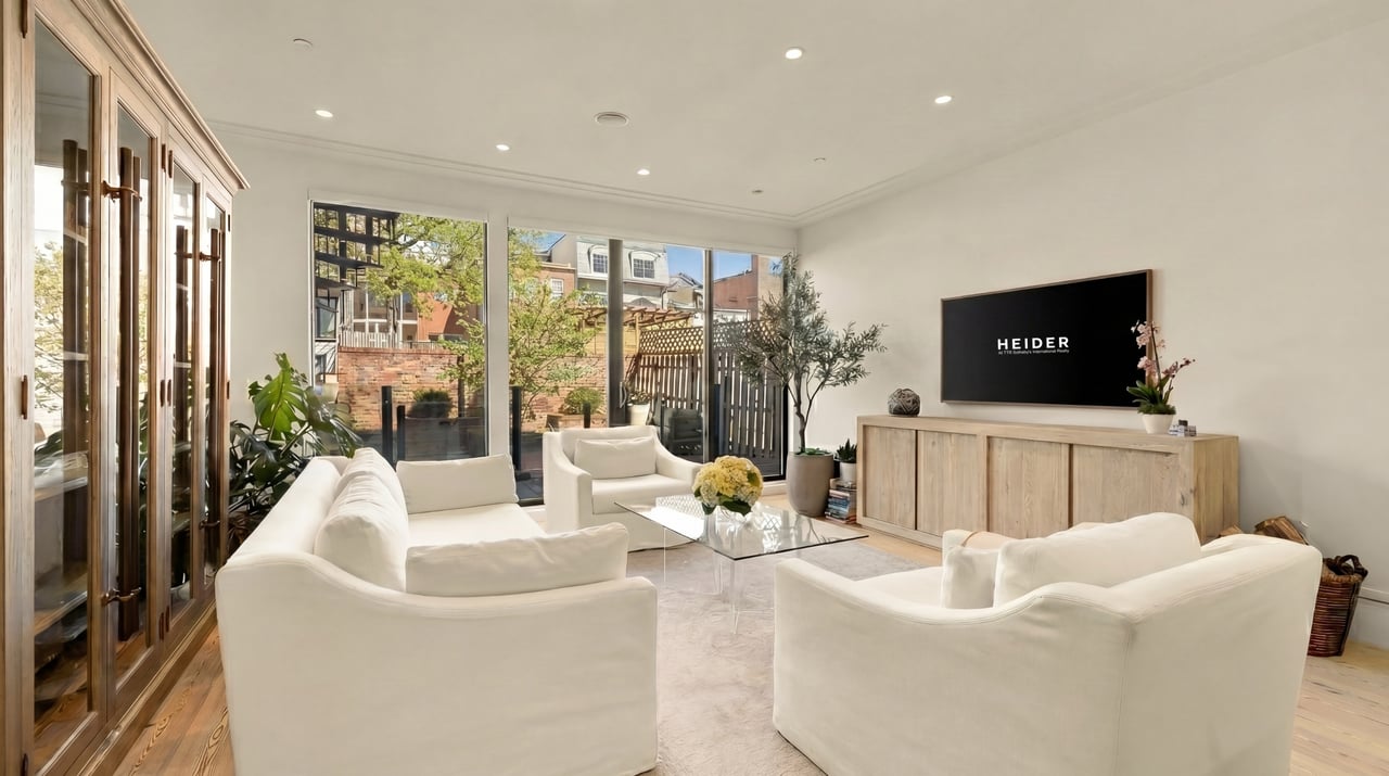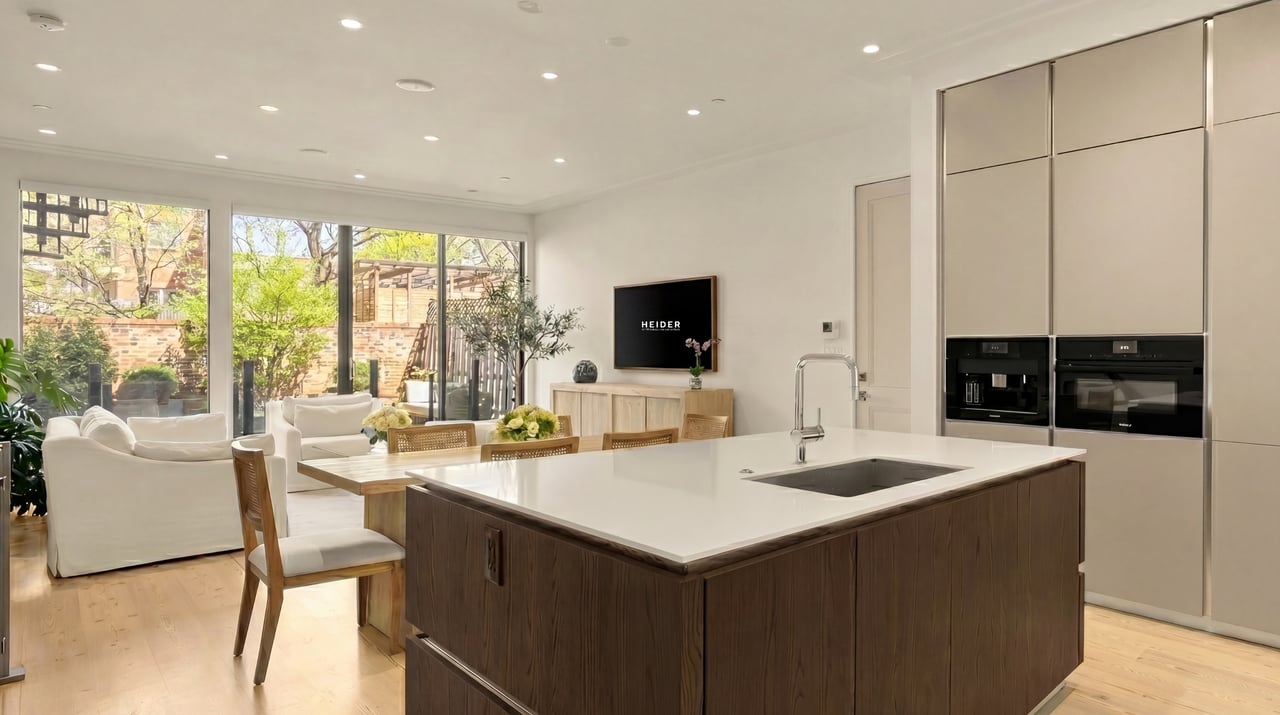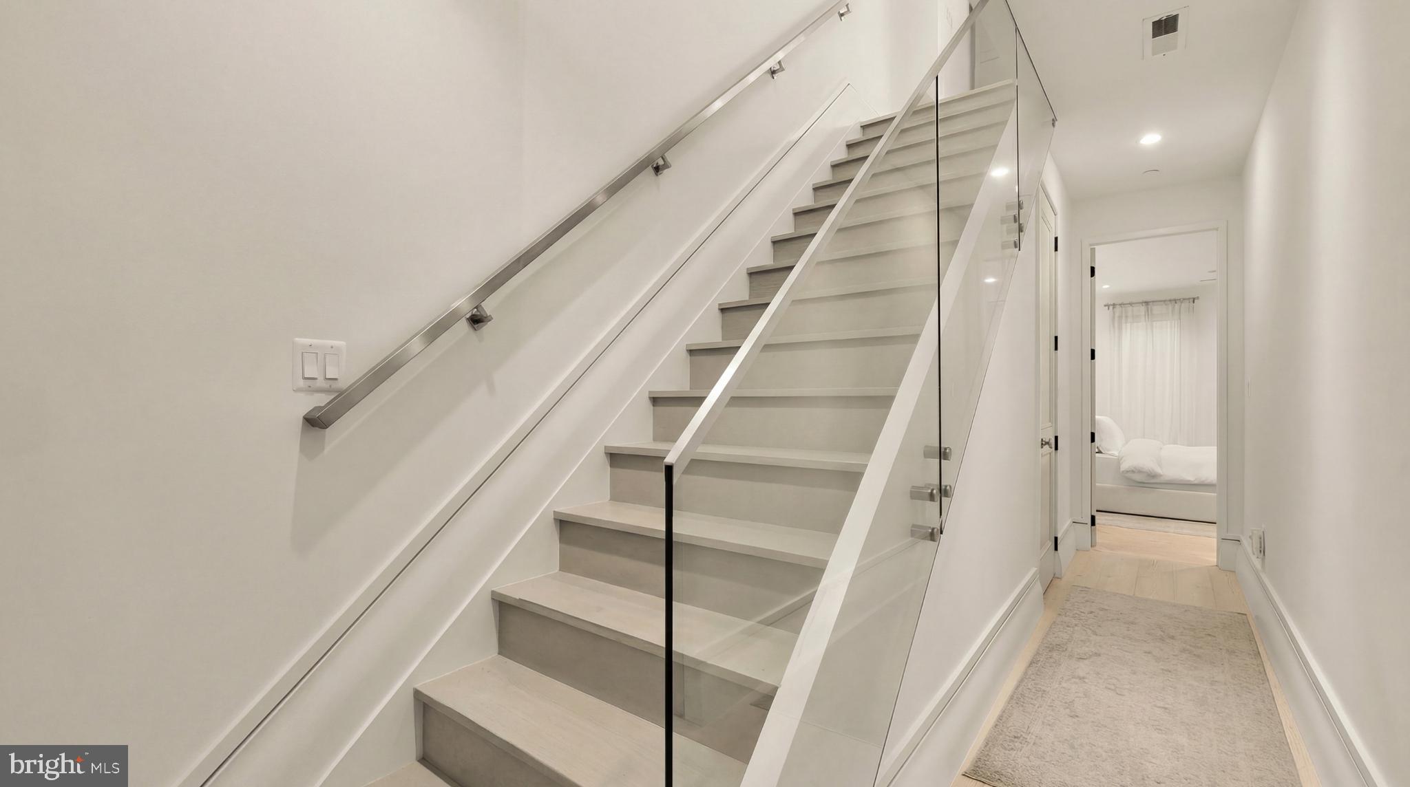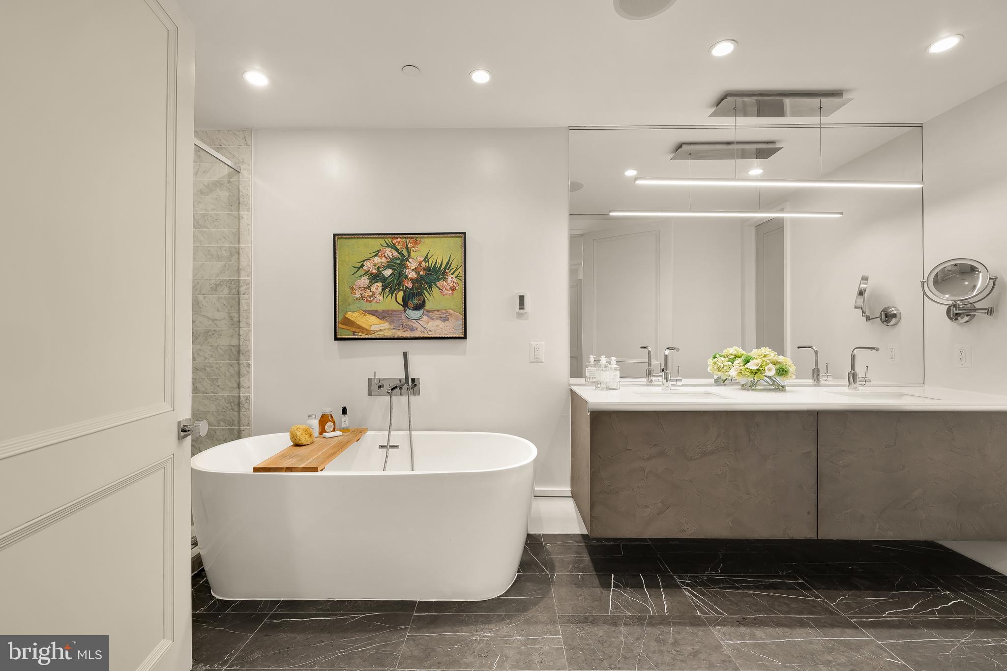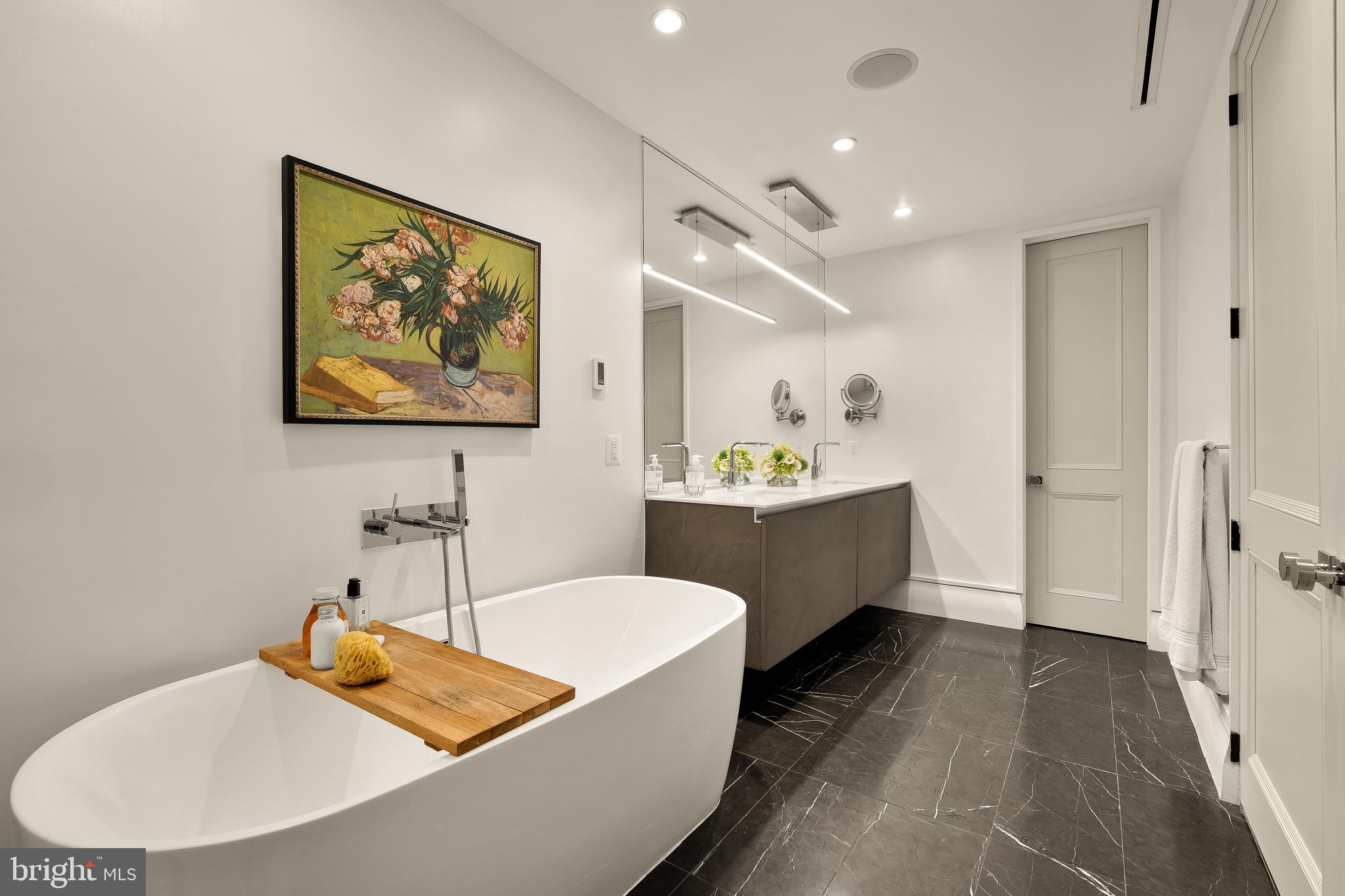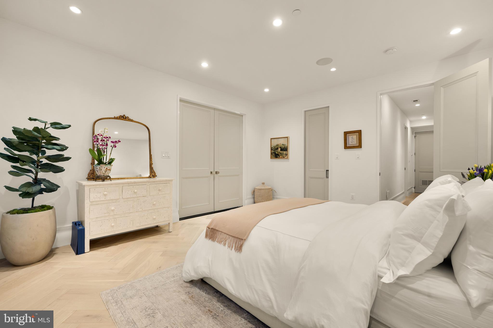 1837 Wyoming Avenue is located on a tranquil block, straddling the boundary between the prestige of Kalorama and the energy of Adams Morgan, a boutique building comprising of luxury condominiums finished to the highest degree. The facade of the building evokes reserved elegance with its inlaid red brick and classic dormers. Amongst this distinguished company is Unit B, a private rear duplex spanning a generous 1,633 square feet of elegant living space. The main level is a fully open concept space encompassing living, dining, and kitchen areas. High ceilings, wide-plank white oak floors, recessed lighting, and a floor-to-ceiling glass wall opening onto the rear patio. The chef's kitchen combines form and function, with Italian cabinetry complementing a herringbone marble backsplash and contrasting Dekton center island and suite of Miele appliances, including a commercial-grade gas range and built in espresso machine. The outdoor space, with its brick paver patio, and uplit landscaping, is a coveted amenity in such a central location. A glass-railed staircase leads down to the bedroom level, where the primary bedroom showcases herringbone white oak floors. Double doors open into the ensuite bath with contrasting dark and light marble, featuring heated floors, a double floating vanity, freestanding soaking tub, and oversized walk-in glass shower. A walk-in custom California Closet completes the suite. The second bedroom also features ample storage and a marble ensuite bath with radiant floor heating. Glistening Emtek hardware and a surround sound system are found throughout. Convenient in-unit laundry, a separate powder room, and available RENTAL PARKING are additional desirable features. A second rental space is also available. The location is truly incomparable, being steps from the natural retreat of Kalorama Park, and vibrant dining scene including Lapis, Maison Bar a Vin, Cana, and Tatte.