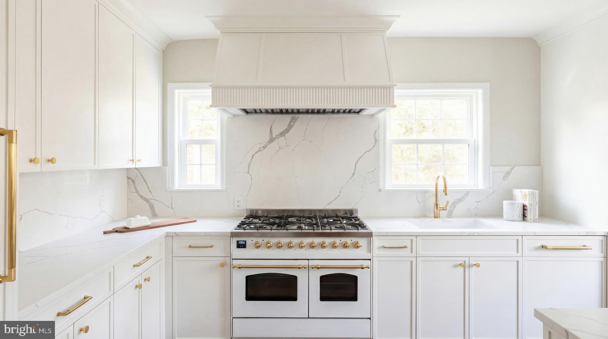 The kitchen serves as a true focal point, pairing custom cabinetry by Akseizer Residential with quartz countertops and an integrated stone sink. A Waterworks unlacquered brass faucet adds warmth and character, while a suite of Bosch appliances, including integrated refrigeration, dishwasher, and microwave, is complemented by a statement Ilve 40-inch dual-fuel range in a limited-edition white finish with brass hardware.