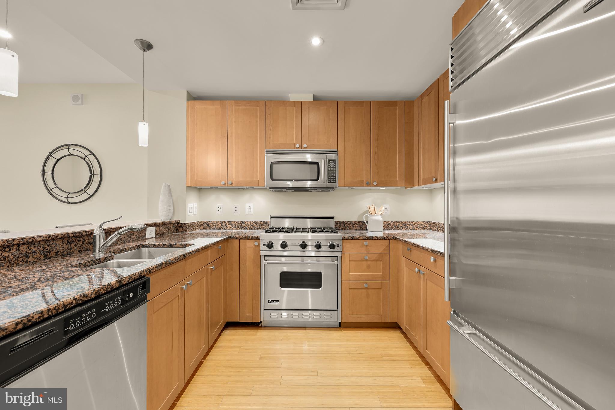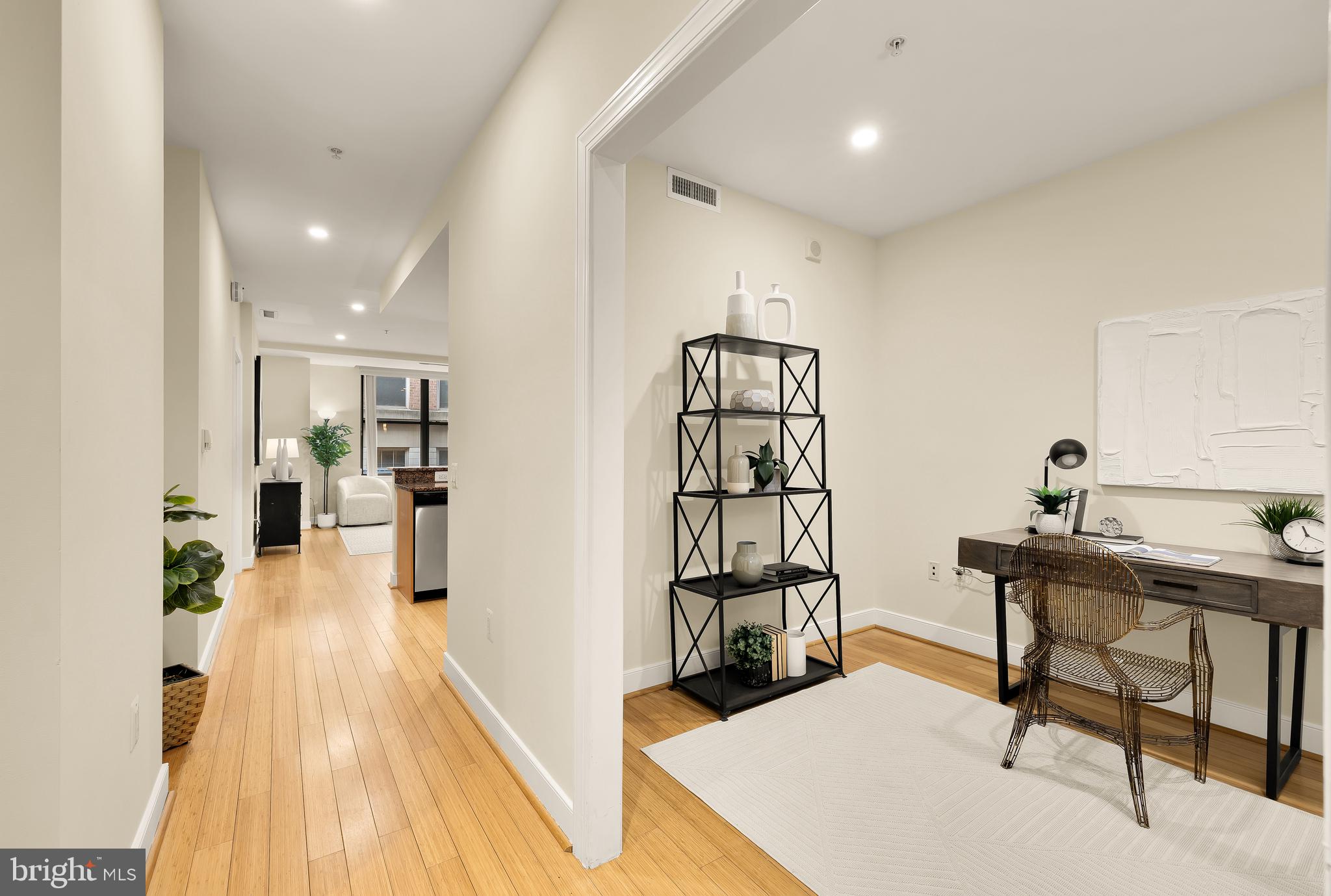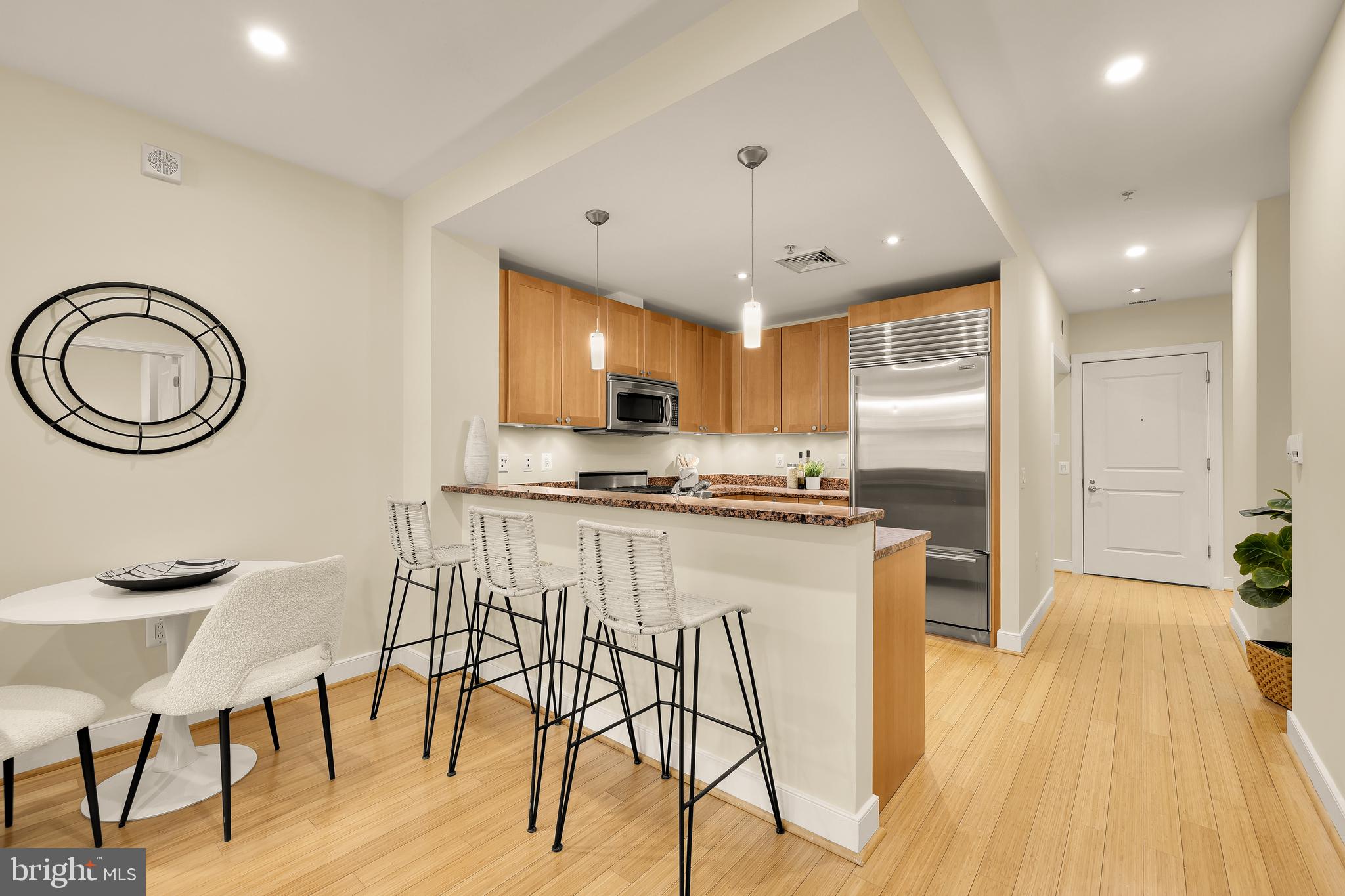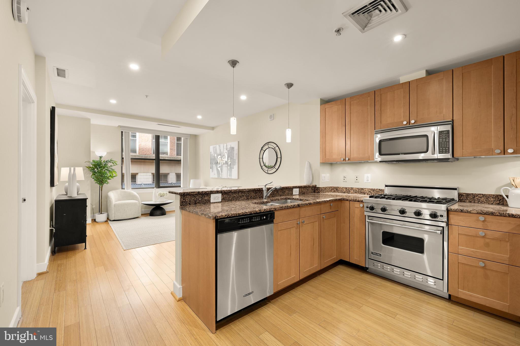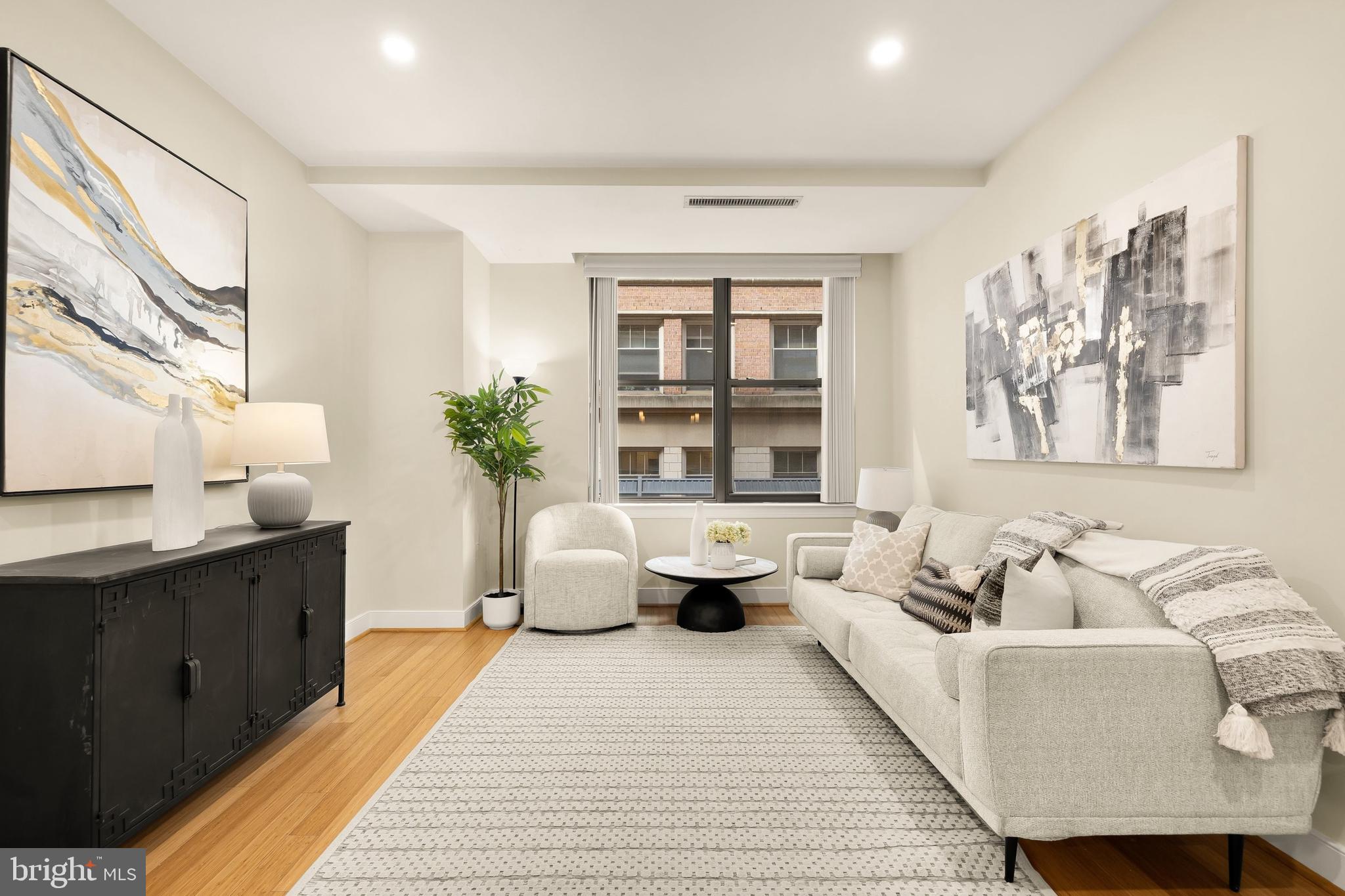 Prominently occupying a large parcel in the heart of Washington's glittering West End is The Columbia, a 2006 reinterpretation of a historic 1918 building, creating 225 luxury condominiums of the highest caliber. Approached by a sweeping, verdant crescent drive, the building's classic red brick facade is flanked by twin contemporary glass additions to create a dramatic, architecturally significant first impression. Within this rarified air is Residence 234, a one bedroom and den unit spanning a generous 812 square feet of immaculately maintained, sumptuously appointed living space. A vestibule provides a dignified entrance to the home. Immediately adjacent is the private den, a quiet space tucked away and ideally suited for a private office, reading nook, or yoga studio. At the heart of the floor plan is the chef's kitchen. Elegant Poggenpohl cabinetry, granite countertops, and an integrated breakfast bar open up to the main living space. A commercial-grade Viking range and full-size SubZero refrigerator represent top-of-the-line equipment and are an indicator of the no-expenses-spared ethos found throughout. Bright and airy, the main living area is flooded with natural light from a large double window. Likewise, the bedroom suite features floor-to-ceiling glass through which the private balcony can be accessed. A pass-through dressing area framed by ample walk-in closet space leads to the primary bath. Clad in marble, the luxurious retreat boasts a large vanity and a combination tub and shower. A private, underground parking space conveys. An amenity-rich building, The Columbia features a rooftop swimming pool and sundeck, state-of-the-art fitness center, 24-hour front desk with security, billiards room, recreation room, business center, on-site management and maintenance, as well as available extra storage units for a true turnkey lifestyle. A Trader Joe's is accessible from within the building, and the location is convenient to West End's famous restaurants, shops, and public transit. Blending historic character with a contemporary lifestyle, Residence 234 at The Columbia represents the apex of upscale urban living.