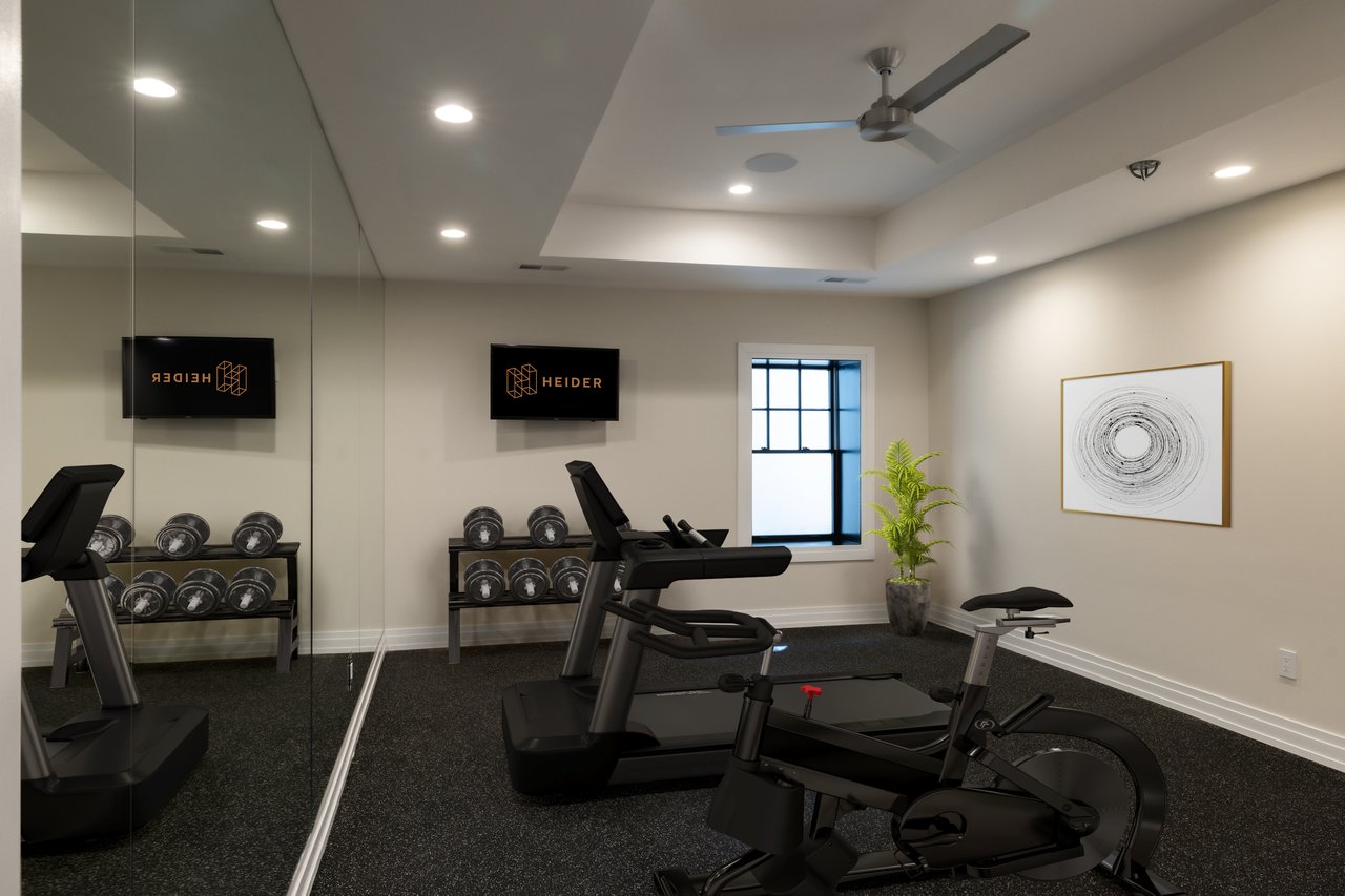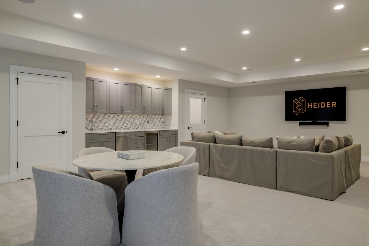 The finished lower level includes high ceilings, a recreation room with integrated Sonos sound, a wet bar with a Sub-Zero beverage fridge, a custom wine room, a fitness studio, a powder room, and a second laundry area. A private guest or au pair suite features a kitchenette, bedroom, and full bath.