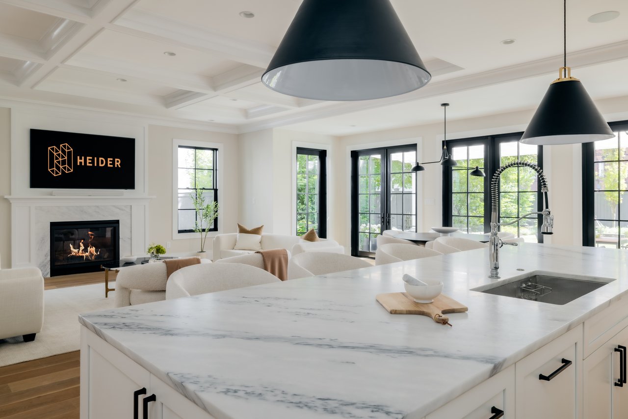 The formal living room, with a gas fireplace and custom built-ins, overlooks the front garden. A tray ceiling and wainscoting in the adjacent dining room elevate formal gatherings. A marble-clad butler's pantry with a beverage fridge connects seamlessly to the chef's kitchen, which features custom stacked cabinetry, Wolf and Sub-Zero appliances, a full-height marble herringbone backsplash, and an expansive island with bar seating.