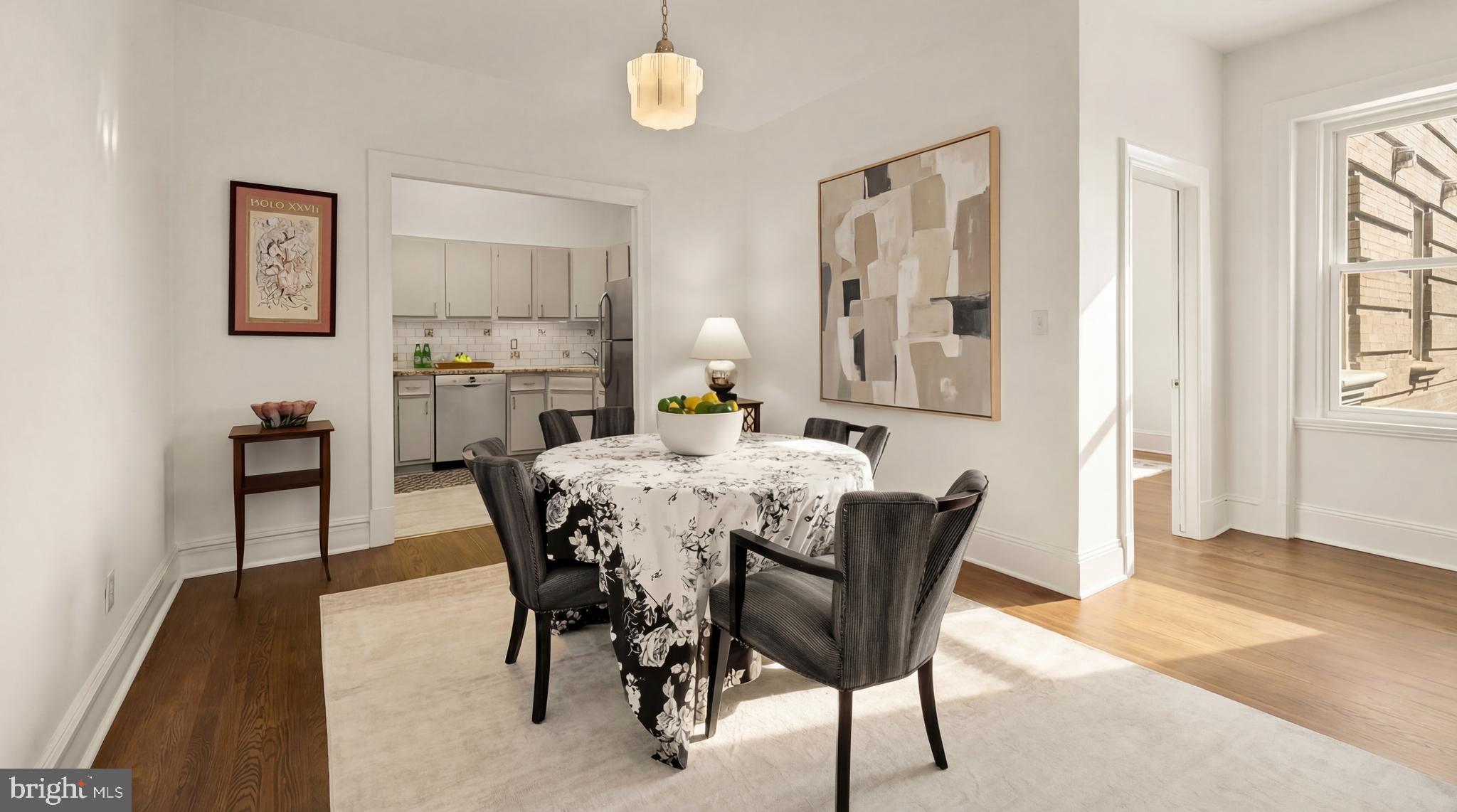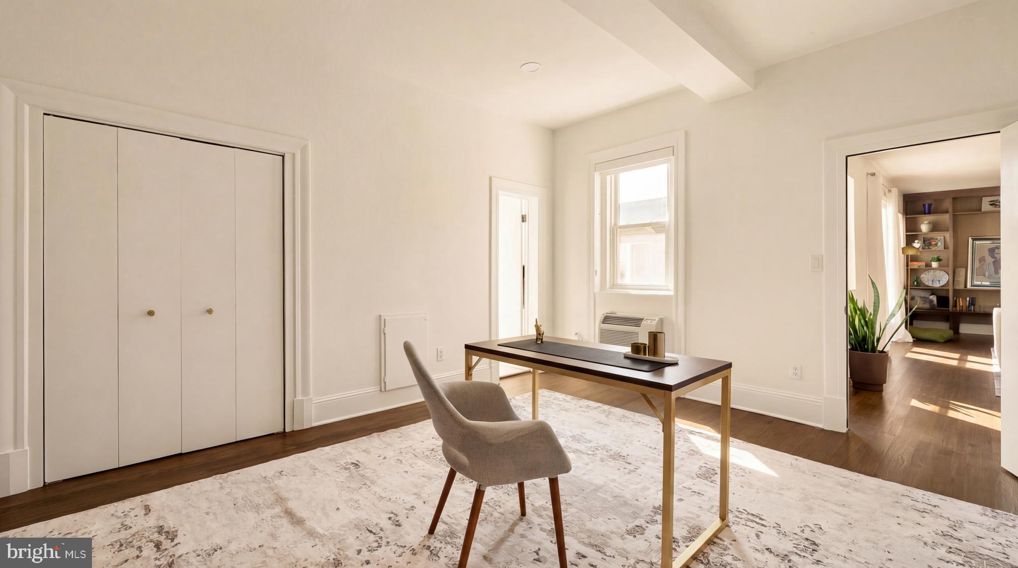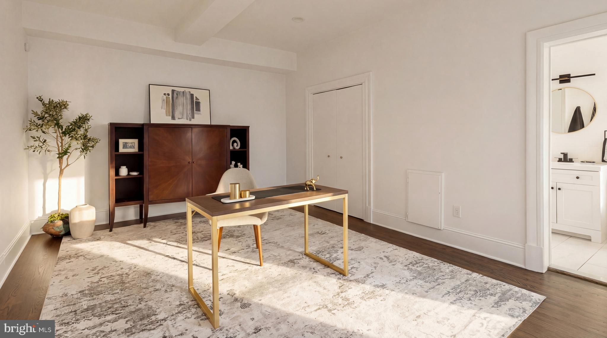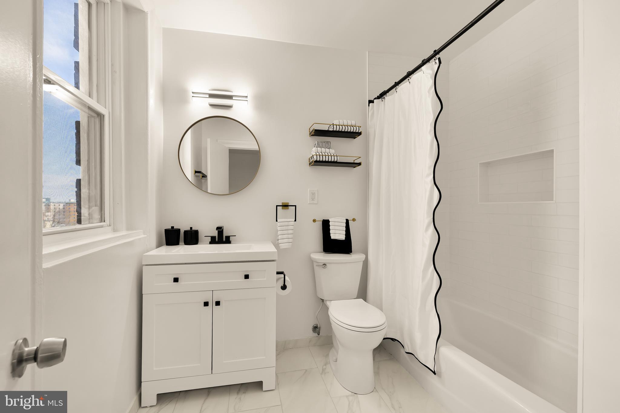 Set far back from the road and elegantly approached by a verdant, sweeping crescent driveway, the Northbrook condominiums are a defining example of early 20th century architecture. Separated into two relatively boutique-sized buildings, the ethereal lobby creates a grand initial impression with its deeply recessed arched windows, intricate plaster moldings, and ornate fixtures. A distinguished two-bedroom residence with two full baths, Unit 501 spans a generous 1,404 square feet of thoughtfully updated living space blended with a full retention of the historic charm associated with the building's pre-war heritage. High ceilings over 9 feet, and hardwood floors are constants throughout. The floor plan revolves around a rare, large open concept living and dining area. Flooded with natural light and enjoying sweeping views the space is anchored by a stylish wall of built-ins on one end and an ample dining nook on the opposite. The latter opens into the spacious kitchen, featuring a suite of full-size stainless-steel appliances including a high-end Bosch dishwasher, as well as a convenient service entrance to enable seamless entertaining. The two large bedrooms both feature ensuite baths, newly reimagined with porcelain floors, white vanities, and subway-tiled tub and shower combinations. Ample storage abounds, with the primary suite showcasing a custom walk-in closet with extensive built-ins. A walk-in, in-unit laundry room completes the residence as a truly coveted amenity in a central urban location. Northbrook II includes a showstopping roof terrace with unbroken, 360-degree views of the city and beyond, as well as a shared courtyard and resident parking lot for a turnkey lifestyle. Walkable to cafes and eateries along Mount Pleasant Street such as La Dona Cafe, Elle, Raven Grill, Joia Burger and OKPB speakeasy complimented by easy public transportation with a metro station less than a half a mile away in Columbia Heights and green space throughout Rock Creek. Unit 501 at Northbrook II is a fine example of elevated modern city living in a pre-war era style . Pet Friendly and Investor Friendly, 27 Shared Parking Spaces for 55 Units