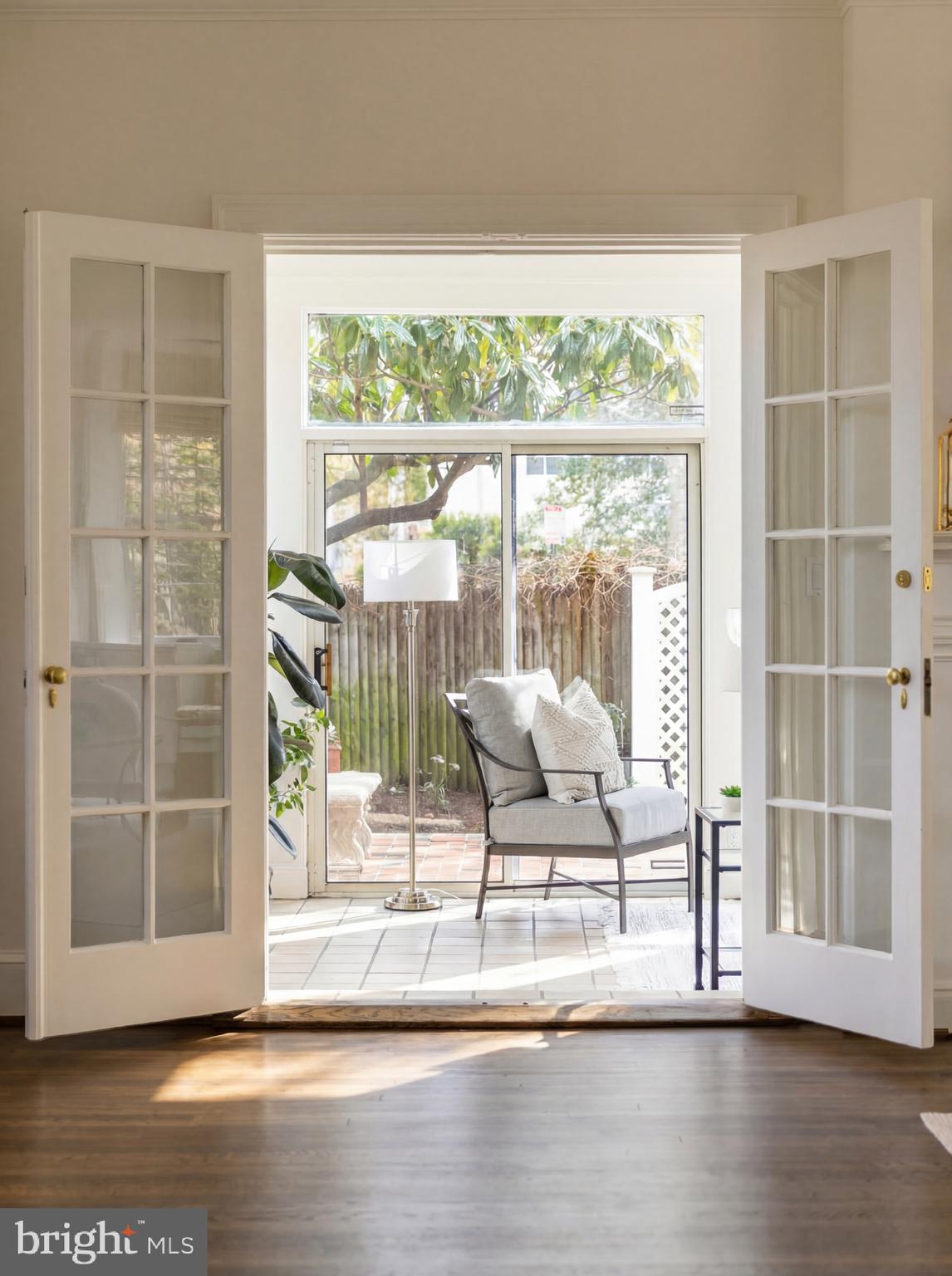 The front door opens to a classic center hall floor plan showcasing gleaming, refinished dark hardwood floors. Flanking the foyer are formal living and dining rooms. The living room spans the full depth of the home and is anchored by a fireplace, highlighted by a bay window with built-ins overlooking the lush rear grounds. Two sets of French doors open seamlessly to the sunroom, while multiple sliding glass doors connect to a private brick patio, creating an effortless indoor-outdoor flow.
