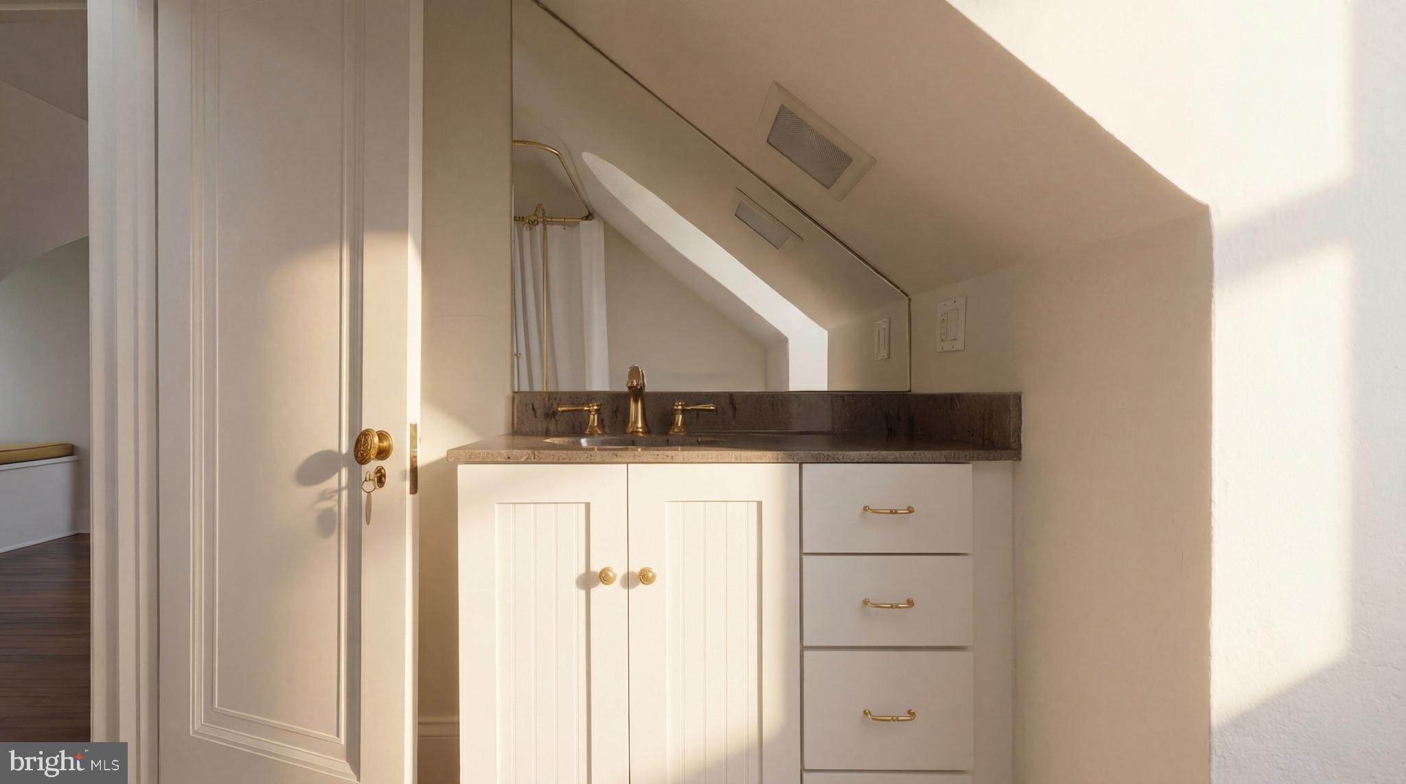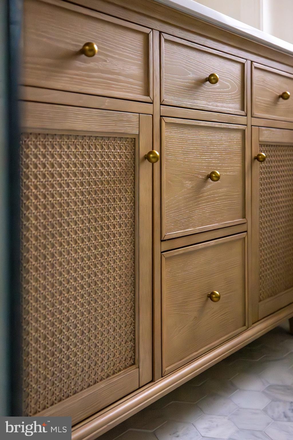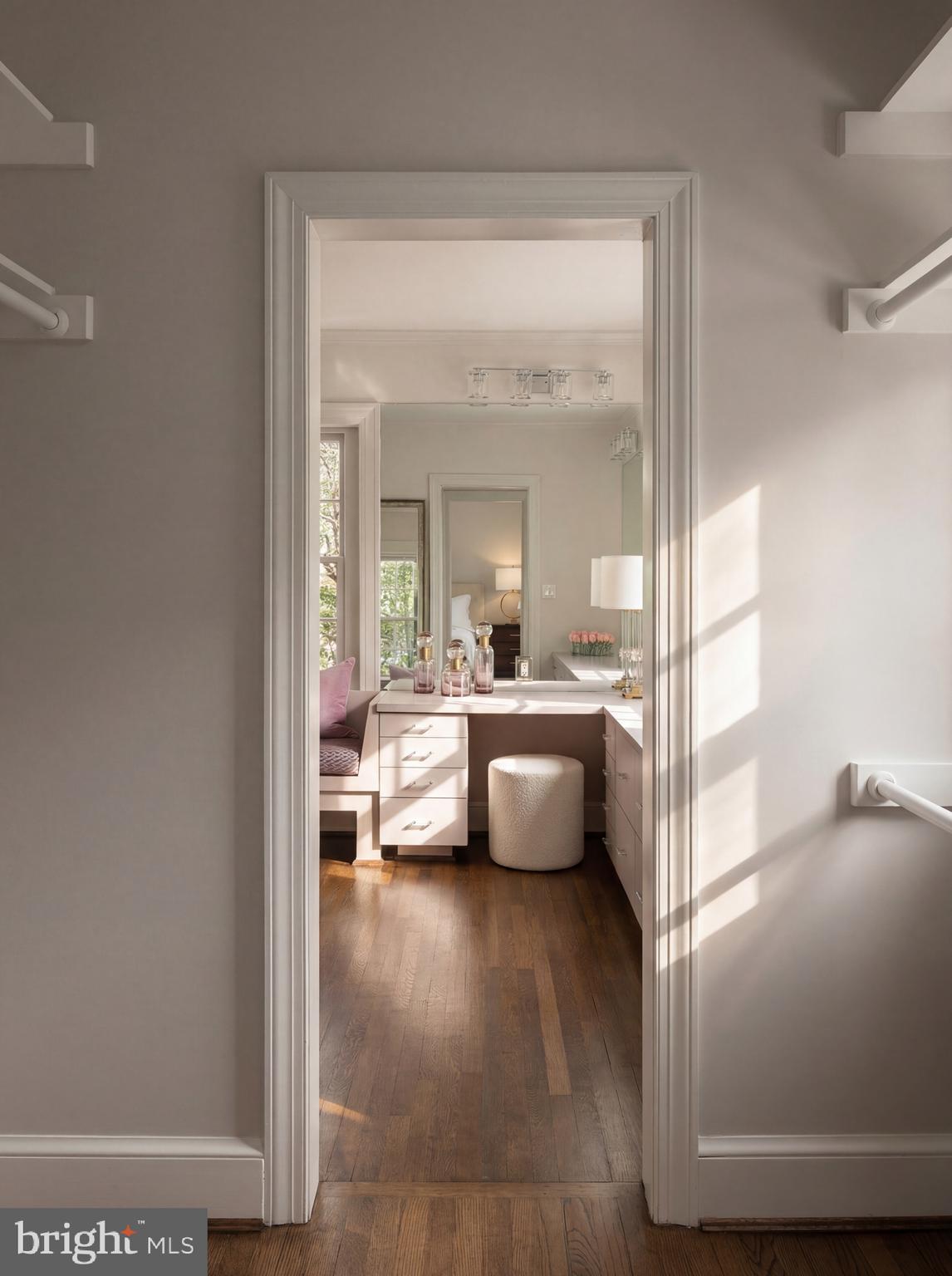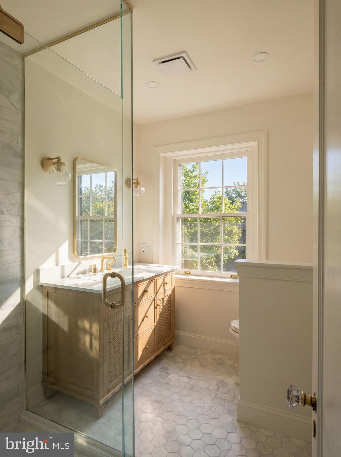 Upstairs, the expansive primary suite serves as a private sanctuary, with two walk-in closets and a light-filled dressing room with a dedicated makeup vanity. The en-suite bath is elegantly appointed with dual vanities and a skylit shower-tub combination. Two additional bedrooms share a hall bath finished in Carrara marble with a contrasting vanity and warm metallic fixtures. The top level offers two additional bedrooms, a cedar closet, ample storage, and a full bath featuring a classic cast iron tub and shower.