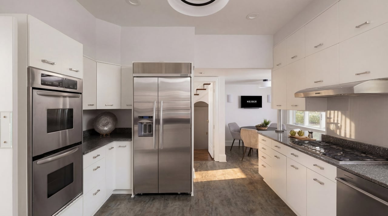 The dining room is intimate yet spacious and features French doors opening to a well-appointed study, an ideal post-dinner retreat. The kitchen introduces a contemporary counterpoint with sleek European-style cabinetry, granite countertops, and a full suite of high-end stainless steel appliances. It flows naturally into a bright breakfast nook, and a powder room completes the main level.