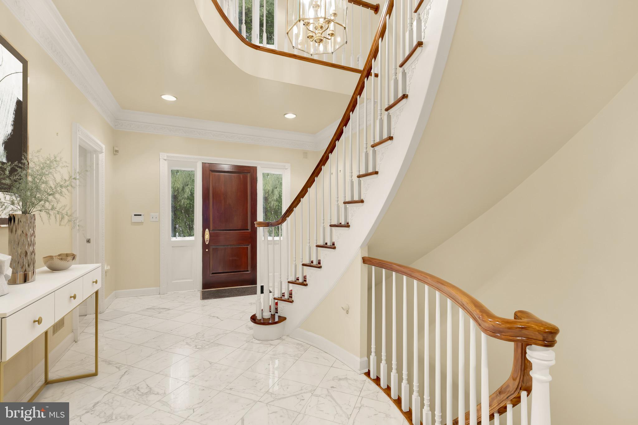 The Berkley neighborhood residences are synonymous with quiet luxury and restrained elegance. Nestled within the newest section of Battery Kemble Place, this distinguished enclave, on the site of the former Rockefeller Estate, is 4813 Kemble Place. The home is a classic brick colonial blending traditional principles with modern livability. Perfectly symmetrical, the facade evokes cues from classic estates of the past. Inside, the central entry hall creates a formidable initial impression, with gleaming Carrara marble floors and a sweeping grand staircase. Detailed plasterwork throughout the main level consists of thick, carved crown moldings and archways framed by columns. Formal rooms are generously proportioned. The dining room is embassy sized, with two walls of glass and access to a private balcony for al fresco entertaining during the warmer months. A substantial living area in the rear spans the entire width of the home. Lavishly appointed yet still warm and intimate, the space features accent lighting and is anchored at one end by an intricate, roaring fireplace. A wall of double casement windows and access to a second private balcony complete the area. Upstairs, the primary suite is accessed through double doors. The large sleeping area connects to a five-piece marble bath and walk-in closet space. Secondary bedrooms are each ample in both scale and storage. The grand staircase leads to the walkout lower level in a gracious arc. Sitting above grade, the ethereal space is flooded with natural light. A large recreation room features extensive built-ins on two walls, flanking a roaring fireplace. A professional, mirrored fitness room and guest bedroom complete the space. Shaded by verdant foliage and shrouded in privacy, the rear lawn offers usable green space. Convenient to Georgetown, Downtown, and major commuter routes, 4813 Kemble Place is an exemplary residence in one of DC's most sought-after locations.